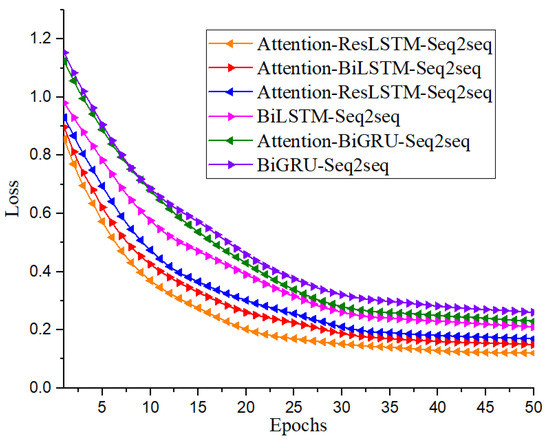 We added the attention mechanism [33] in BiLSTM-Seq2seq, BiGRU-Seq2seq, and ResLSTM-Seq2seq. Attention-BiLSTM-Seq2seq, Attention-BiGRU-Seq2seq, and Attention-ResLSTM-Seq2seq were obtained. We kept other parameters unchanged, the GPT pre-training model was used to obtain the text representation of rice-related question-and-answer pairs, and training was carried out on the data set of rice-related question-and-answer pairs. Figure 8 shows the loss rate trend chart of six rice-related knowledge question and answer models in the rice-related question-and-answer training set. Compared with the other five rice-related generative question and answer models, the Attention-ResLSTM-Seq2seq model converged faster after 30 rounds of training. It can be seen from Table 6 that the BLEUs and ROUGE of Attention-BiLSTM-Seq2seq have increased by 1.9, 1.1, 1.3, 0.5, and 1.1 percentage points, respectively, compared with BiLSTM-Seq2seq. Compared with BiGRU-Seq2seq, the BLEUs and ROUGE of Attention-BiGRU-Seq2seq are increased by 2.3, 2.1, 0.3, 0.8, and 2.1 percentage points. Compared with ResLSTM-Seq2seq, the BLEUs and ROUGE of Attention-ResLSTM-Seq2seq increased by 2.3, 2.1, 0.3, 0.8, and 1.9 percentage points, respectively. It showed that the attention mechanism can effectively improve the accuracy and comprehensiveness of answers generated by the question-answering model. The attention mechanism can strengthen the weight information of keywords in rice questions between encoder and decoder and make the neural network better understand the semantics of questions and analyze the characteristics of questions. Attention-ResLSTM-Seq2seq achieved the best effect among the six models, with BLEU1, BLEU1, BLEU1, BLEU1 and ROUGE reaching 37.7%, 36.6%, 34.9%, 32.1%, and 37.8%.