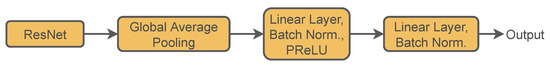 For our proposed architecture, the embedding model is implemented using ResNet [27] architecture due to its simplicity and scalability. ResNet implements identity mapping connections which is the improved version of residual units. The embedding model inherits the top convolution layers of ResNet, and the linear classification layers are excluded from the ResNet model. PReLU [28] activation is used inside the model to avoid dead neurons. Figure 4 illustrates a basic flow diagram of the embedding model. The output is passed directly from a batch normalization layer similar to SimSiam [15]. Adding batch normalization at the end of the output gives better stability in cluster purity and learning. An l2 weight regularization of is used while training. Moving average weight is implemented with a decay rate of 0.4. Adam [29] with a learning rate of is used as an optimizer.