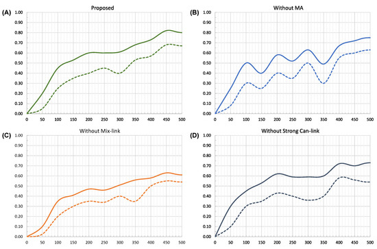 Figure 6D further illustrates a scenario without the strong can-link pairs. The model swiftly improves its accuracy in the first 50 epochs of the training, as it does not rely on its own inaccurate data link pair. However, the peak accuracy of the model falls behind compared to the proposed model.