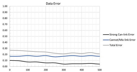 The figure illustrates the erroneous data ratio passed to the model while training. The horizontal and vertical axis represents epochs and error ratio, respectively.