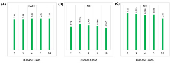 Compared to other methods, the proposed strategy achieves better CACC and ARI scores. As CACC and ARI scores indicate the quality of clusters, it can be validated that the proposed method performs better in clustering leaf disease data. Also, the ACC score remains competitive for most classes. Increasing the number of classes does not significantly affect the model’s performance. Hence, the benchmarks validate that the proposed method performs better.