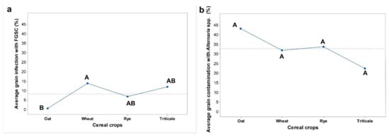 Average FDKs (a) and ACKs (b) on wheat, rye, triticale and oat cultivated as monocrops and intercropped with pea. Tukey’s pairwise comparisons of means were performed with 95% confidence. The means that do not share the same letter are significantly different.