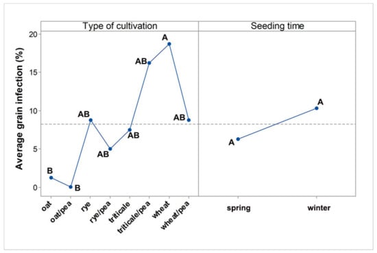 Factorial plots indicating effects of type of cultivation and seeding time on the FDKs of cereal crop species. Tukey’s pairwise comparisons of means were performed for 95% confidence levels. The means that do not share the same letter are significantly different.
