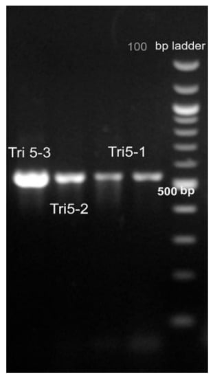 Trichothecene genotyping of the FGSC isolates was performed on the Tri3 and Tri5 genes using the primer sets Tri315F/R, Tri303F/R and Tri5F/R (Table S1). All F. graminearum s. stricto isolates were shown via the Tri315F/R primer pair to be 15-AcDON producers. Only 9.4% of the isolates were not identified as 15-AcDON producers; all of them belonged to F. graminearum s. lato or were not identified, although they exhibited morphological features similar to those of members of the FGSC (Table 3). Isolates that were not identified as 15-AcDON producers were subjected to genotyping with Tri303F/R; none of them were shown to be 3-AcDON producers. Further characterization with the Tri-5F/R primer pair confirmed that the unidentified isolates are trichothecene producers (Table 3). When testing these isolates with the Tri-5F/R primer pair, all isolates produced high-intensity DNA bands on agarose gels (designated Tri5-3), except for three isolates originating from rye. These isolates from rye were identified as F. graminearum s. lato and produced PCR bands fainter than the Tri5-3 bands (designated Tri5-2 and Tri5-1) (Figure 3).