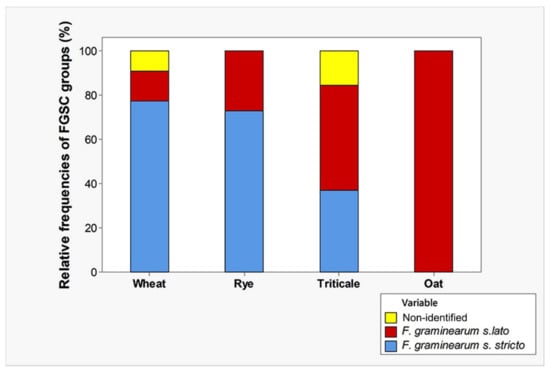 The isolates originating from wheat seed samples were identified predominantly as F. graminearum s. stricto (77.3%). Only 13.6% and 9.1% of FGSC members isolated from wheat were identified as F. graminearum s. lato or were unidentified, respectively (Figure 4). A similar proportion of F. graminearum s. stricto was found on rye, where F. graminearum s. stricto accounted for 72.7% and F. graminearum s. lato accounted for 27.3% of isolates. The largest proportion of F. graminearum s. lato and unidentified isolates of FGSC was found on triticale (63.2%) (Figure 4). Only one isolate originated from oat was identified as F. graminearum s. lato. A relatively large proportion of F. graminearum s. lato and unidentified isolates on triticale drew our attention. Multiple stepwise regression analysis showed that cereal crop species affected the frequencies of F. graminearum s. stricto (p = 0.003), F. graminearum s. lato (p = 0.08) and unidentified isolates (p = 0.02). This implies the possibility that stratification of FGSC members occurs among different cereal crop species in the same growing area (Figure 4).