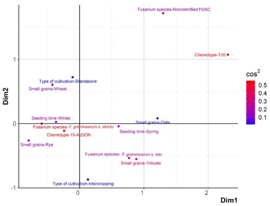 Multiple correspondence analysis (MCA) between cereal crop species (wheat, rye, triticale, and oat); seeding time (winter and spring); type of cultivation (monocrop and intercrop); the presence of F. graminearum s. stricto, F. graminearum s. lato, unidentified (FGSC) members and chemotype groups (15- AcDON and trichothecene producer indicated only by expression of Tri5 gene). Squared cosine (cos2) indicated the quality of association between variable categories and a particular axis. Red-colored variables indicates the highest degree of association with the first two dimensions. Dim1 refers to the first dimension of MCA analysis. Dim2 refers to the second dimension of MCA analysis.