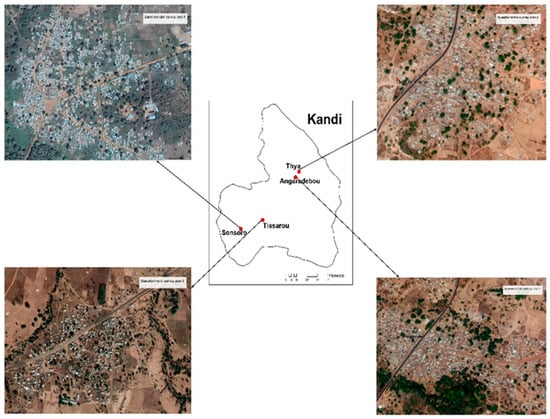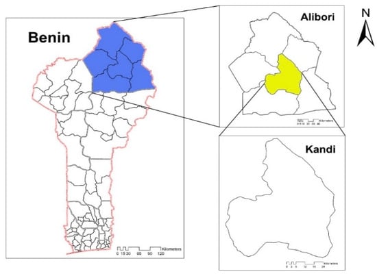 In the Alibori department’s center, Kandi (Figure 1) is located in the cotton basin’s agro-ecological zone. It covers 3421 km2, or almost 13% of the department’s total area. The terrain is formed by a sandstone plateau cut by the Sota and Alibori valleys, the town’s two major rivers. There are certain hills constructed of hard rocks such as granite and quartzite, and the area has a Sudanese climate, with a rainy and a dry season. In the study area, the climate is defined by precipitation ranging from 0.1 to 245 mm, and temperatures ranging from 16 to 35 °C. Kandi features a unique form of tropical ferruginous soils with leached hylomorphism that favors cotton growing at the edaphic level. The study area is considered among the top four of the largest cotton-producing communities in the Republic of Benin. In the study area, agricultural production between 2017–2018 was estimated at 55,744 tonnes. The vast majority of people in the study area are agricultural producers, and only a small number are formal business people. Agriculture, animal husbandry, trading, transportation, and, on occasion, hunting and fishing, sustain the economy of the Kandi village.