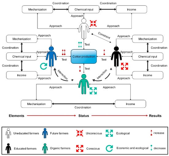 The framework of the present study (Figure 2) is formed of four primary statuses, according to the design considerations: the research framework exposes the current state of the study area and projects an idea of the type of farmers that would be suitable. Based on information from several different studies in the literature [,,,,], four types of farmers were identified that coincide with the different farmers in the study area. For this reason, the study framework considers these four cases of farmers. Improving the use of agricultural chemical inputs and agricultural machinery and, consequently, increasing agricultural production, could be possible in the study area. To establish how, we used the research framework below: