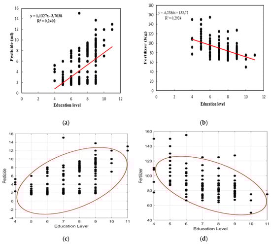 From Figure 4a,b, it is noted that the education level of educated farmers impacts pesticides and fertilizer use. In this analysis, the significance of R2 is equal to 1. A result under 0.1 can be considered as any relation available between two variables. Educated farmers (Figure 4a), from the viewpoint of pesticide use and education level, exhibit a matching correlation R2 near 1, at 0.2924. Figure 4b shows the matching between the fertilizer use and education level of educated farmers, and the R2 is 0.2402, again close to 1. Figure 4c,d show the 95% confidence ellipse between these two variables.