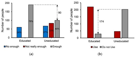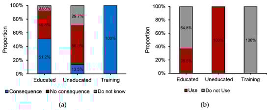According to the survey conducted for this research, 76% of educated farmers have adequate basic knowledge of chemical inputs and can utilize them correctly, healthily, and effectively. On the contrary, more than 60% of uneducated farmers do not know how to apply chemical inputs correctly, which significantly limits the favorable advantages of chemical inputs to cotton planting (Figure 5a). In addition, whether farmers are educated also affects their attitude towards the protection of their safety. For instance, 88.4% of educated farmers use protective wear when treating the field, and the remaining 11.6% of educated farmers do not use protective clothing due to the lack of money to purchase them, but are aware of their importance. In contrast, 81.2% of uneducated farmers admit they do not use protective clothing when treating fields with agricultural chemical inputs, leaving just 18.8% that use protective clothing (Figure 5b). Some farmers, mostly those that are uneducated, ignore the importance of the use of protective clothing. These farmers are not interested in wearing protective clothes, arguing that the use of protective clothing is a waste of money.