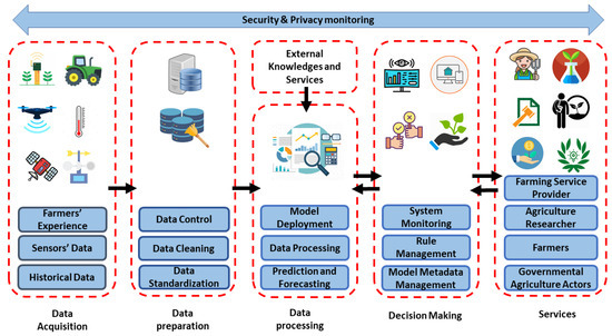 According to Figure 1, in the data acquisition stage, data are collected from diverse sources, such as farmers, sensors, and satellites, as well as external databases such as weather and climate data. The collected data from these different sources can be in different formats that are not compatible to be stored in a unique database. In addition, some collected data may contain incomplete data, missed values, outliers [25], and anomalous instances [26]. To address these problems, in the data preparation stage, best practices for data preprocessing can be used to prepare data for further analysis. These practices include standardizing data to a predefined format, identifying and deleting duplicated data, handling the gaps in generated data, and validating data sources and contents. Additionally, the collected data from different sources can be stored in a common infrastructure and can be integrated with other data sources that are collected from diverse smart farming systems. These methods assist in ensuring data consistency, completeness [27], and accuracy [28]. The components in the second and the third layers are highly correlated, and many of the smart farming data processing functions can be assigned to both layers. The data processing layer components are the brains of smart farming [29]. Mathematical modeling, statistical methods, or AI methods are used to analyze and extract knowledge from farm data. Machine learning (a branch of AI) consists of intelligent techniques to make automated decisions with limited human involvement. Machine learning can perform rapid optimizations, classifications [30], predictions, and recommendations and add value to the entire system [31]. For instance, SomaDetect Inc. of Fredericton [13], utilizes machine learning for identifying individual cows. This system also monitors the cows to detect disease symptoms through data collected from sensors at milking stations on dairy farms. As another example, AirSurf-Lettuce is an open-source analytic platform that uses machine learning to categorize iceberg lettuces to improve the actual yield and crop marketability before harvesting [32]. Model deployment in the context of machine learning refers to the application of generalizing a model to predict new items in the system. Prediction is according to estimating the outcomes for unseen data that can help to provide predictions. For example, the growth prediction in plants helps farmers to decide about harvest time and plan for the required workforce. Forecasting is a kind of prediction about the future using time-series data. An example of forecasting in smart farming is weather forecasting using temporal information to plan for irrigation [33].