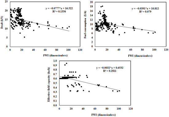 The correlation between the FWI and the performance attributes of effective field capacity, draft, and fuel consumption of the mechanization unit during the soil-tillage process is described in Figure 1.
