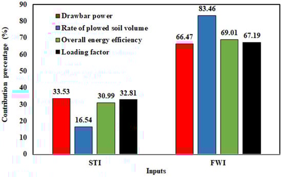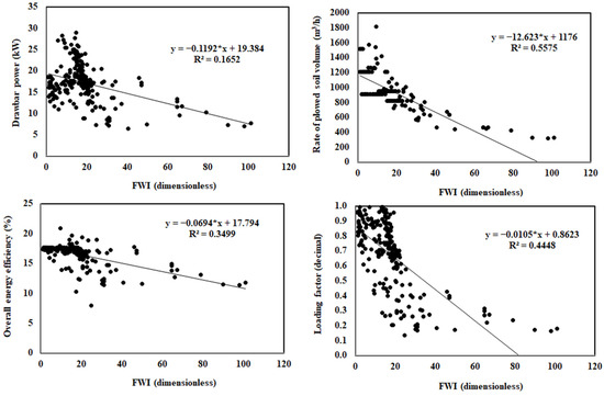 Noticeably, increasing the FWI decreases the draft, effective field capacity, and fuel consumption with a low correlation. This is owing to the explanation of the FWI parameter, which is in the range of 1.07 to 101.17 for the whole dataset. These findings specify that increasing the plowing speed, soil bulk density, plowing depth, and plow width decreases the FWI value at both specific tractor power and soil moisture content. For the FWI creation, increasing tractor power and the soil moisture content at a constant plowing speed, plowing depth, and soil bulk density led to an increase in FWI value. However, Ahmed [62] observed that the draft force of the disk plow working in a soil having clay texture was 11.72 and 12 kN when the tractor power was 60 and 67.5 kW, respectively, with the other variables remaining constant. The correlation between the FWI and the performance attributes of drawbar power, overall energy efficiency, rate of plowed soil volume, and loading factor of the mechanization unit during the soil-tillage process is presented in Figure 2. It is clear that increasing the FWI decreases the drawbar power, overall energy efficiency, rate of plowed soil volume, and loading factor of the mechanization unit during the soil-tillage process.