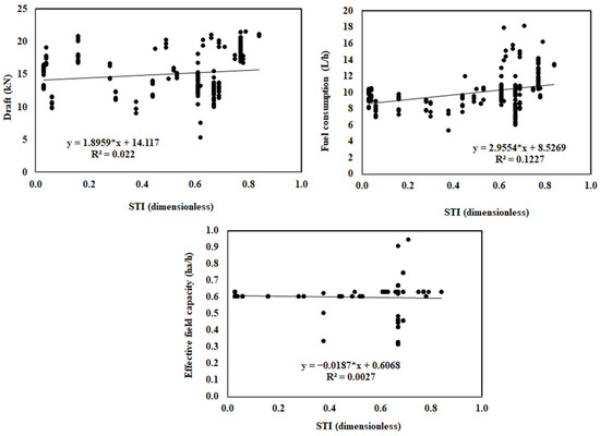 The correlation between the STI, which is in the range of 0.03 to 0.81 for the entire dataset, and the performance attributes of fuel consumption, draft, and effective field capacity of the tractor-chisel plow unit during the soil-tillage process is presented in Figure 3.