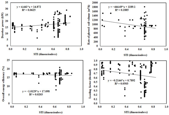 In addition, the correlation between the STI and the performance attributes of OEE, drawbar power, rate of plowed soil volume, and loading factor is shown in Figure 4.