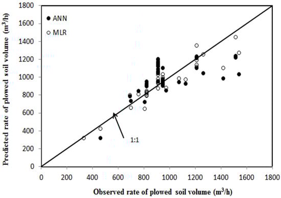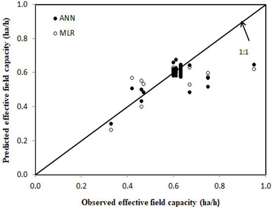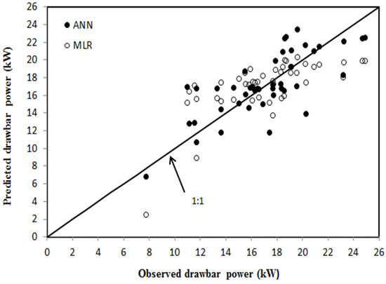 Understanding and quantifying the features of a tractor’s performance, while executing tasks in tillage operations, is a new and valuable asset to agricultural machinery management. The performance knowledge can be used to assess potential machine efficiencies when the tractor is coupled with varying implements [14]. Additionally, the presentation of soft-computing approaches, involving ANN and adaptive-network fuzzy-inference systems, has provided positive results for the analysis of tractive performance of an agricultural tractor under various soil conditions [16]. Therefore, the objective of the current research was to assess the ANN and MLR models’ capability to predict performance attributes of a tractor-chisel plow unit.