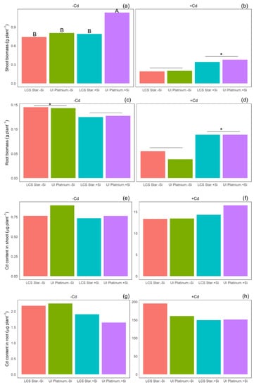 Shoot and root biomass (a–d) and Cd content (e–h) of LCS Star and UI Platinum in response to Si and Cd treatments. Cd content in shoot or root was not significantly different between wheat cultivars or Si treatments (p > 0.05) (e–h). Different letters indicate significant differences in cultivar × Si level at α = 0.05. The symbol “*” indicates significant differences between Si levels at α = 0.05.