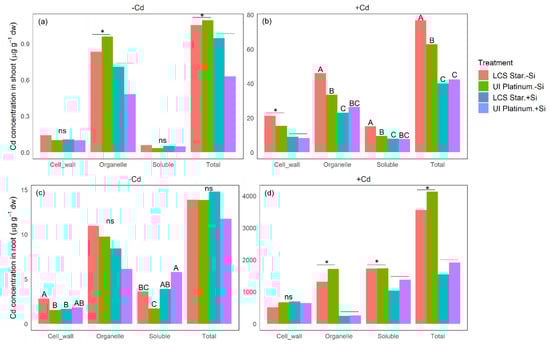Subcellular distribution (i.e., cell wall, organelle, and soluble fractions) of Cd in the shoot (a,b) and root (c,d) of LCS Star and UI Platinum in response to Si and Cd treatments. Different letters indicate significant differences in cultivar × Si level at α = 0.05. The symbol “*” indicates significant differences between Si levels at α = 0.05. “ns” represents insignificant differences.