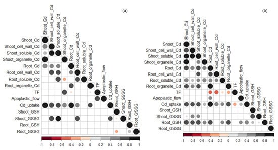 Correlations between Cd concentrations in the shoot and root and their subcellular distributions (i.e., cell wall, soluble, and organelle fractions), translocation factor (TF), apoplastic bypass flow, Cd uptake per unit root length, and concentrations of glutathione (GSH) and glutathione disulfide (GSSH) in shoot and root in Cd-untreated (a) and -treated (b) plants. The circle size and color darkness indicate the correlation coefficient, and blank cells indicate insignificant correlations (p > 0.05).
