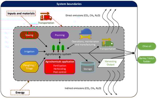 Concerning the environmental assessment, all the inputs used and their respective impacts on the field are accounted as well as the indirect impacts from raw materials extraction. Furthermore, farming activities, machinery operations and transportation of inputs and outputs to the respective destinations are also considered. The system boundaries are depicted in Figure 1, including all the relevant operations for one production (agricultural) year, starting from sowing to the harvesting procedure, including the transportation of the products to the processing unit. The cradle to factory gate variation of the system boundaries is chosen, since the expected yield in a mixed production plan could generate manifold types of outputs (e.g., kg of olives, liters of olive oil, tons of barley fodder, etc.) simultaneously. Thus, the functional unit is set to 1 ha of arable land, in order to minimize potential incompatibilities among different yield types. Apart from the abovementioned, the economic assessment follows a similar approach (EUR/ha) since area-based payments play a significant role to the subsidiary policy of the CAP []. In this context, four cropping management schemes will be thoroughly analyzed, comparing the emissions in equivalents, with the latest Global Warming Potential coefficients (GWP, explained below), and their economic performance in a competitive environment of progressive sustainability.