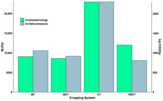 Apart from the impacts to the environment, each activity in relation to farming practices imposes the consumption of energy. In Figure 2, a dual Y-axis bar chart is illustrated, depicting the total consumed energy in MJ ha−1 and the total kg CO2eq ha−1 for each cropping system. In terms of energy consumption, the most demanding system is OT (22,968 MJ ha−1), while the BOT system is the least energy intensive system (8547 MJ ha−1). Nevertheless, practices adopted by BF and VBOT are also not considered energy demanding (9027 MJ ha−1 and 11,983 MJ ha−1, respectively). Although the VBOT system emits lower levels of GHGs, the energy needed for all the relevant cultivation practices exceeds the ten-thousand marker by a significant margin (11,983.09 MJ ha−1). This difference in the amount of energy consumed on the VBOT system is due to a mixture of fungicides and insecticides applied only on the olive trees of this system and not on the BOT system.