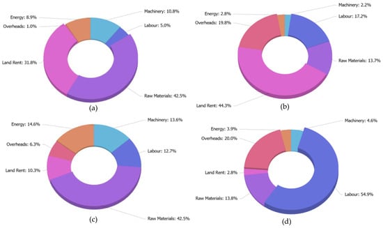 Shares of costs according to the LCC economic analysis for (a) Barley fodder (b) Olive trees, (c) Barley and olive trees and (d) Vetch–Barley and olive trees.