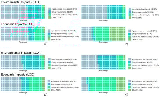 Waffle charts comparing the shares of impacts in LCA and LCC for: (a) Barley fodder (b) Olive trees, (c) Barley and olive trees and (d) Vetch–Barley and olive trees.