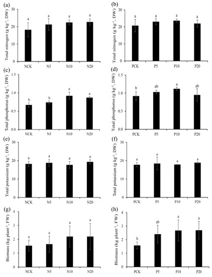 Nitrogen is essential for plants to synthesize nucleic acids, proteins, phytohormones, coenzymes, and chlorophyll; it can promote plant growth and increase plant branches and green leaves [35]. Therefore, a sufficient N source is essential for normal plant growth and metabolism. Under the condition of fixed application rates of N or P and K fertilizers, increasing application rates of either N or P fertilizer did not lead to a statistically significant increase in the total N content in plant tissues.