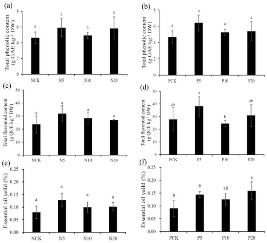 Effects of different fertilizer treatments on total phenolic and flavonoid contents, and essential oil yield in shoots of V. negundo. (a,b) Total phenolic content; (c,d) Total flavonoid content; (e,f) Essential oil yield. Error bars represent standard deviation (n = 5), and bars with the same letter are not significantly different between treatments (p < 0.05, Duncan’s multiple range tests).
