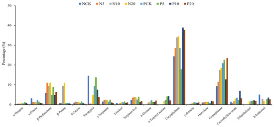 Terpenes are compounds synthesized with isoprene as the main molecular structure. According to the numbers of carbon atoms in the structure, they can be divided into hemiterpenes (5C) and monoterpenes (10C), sesquiterpenes (15C), diterpenes (20C), sesquiterpenes (25C), triterpenes (30C) and tetraterpenes (40C) and others [47]. The essential oil components of plants are mainly comprised of monoterpenes and sesquiterpenes. This study demonstrates that fertilization may affect the profile of essential oil composition, as shown by the differences in the number of essential oil components in different N or P treatments. Regardless of treatments, the sesquiterpene-type β-caryophyllene and eremophilene were the major components of V. negundo essential oil. Studies have shown that β-caryophyllene possesses anti-inflammatory, anti-anxiety, anti-depression and other effects [27], while eremophilene has antibacterial, anti-cancer, and immunomodulatory activities [28]. This study showed that P20 has the highest relative content of eremophilene (23.44%), followed by the P5 treatment (22.61%). P10 exhibited the highest relative content of β-caryophyllene (38.92%), followed by the P20 (37.66%). These results conclude that, under the condition of 100 kg ha-1 N fertilizer application, increasing P fertilization rates can increase the content of the main bioactive constituents (i.e., β-caryophyllene and eremophilene) in V. negundo materials.