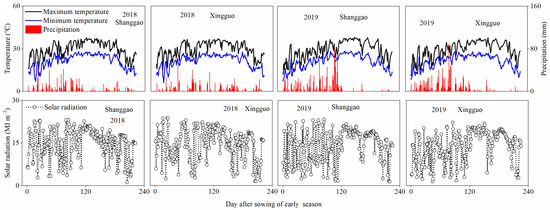 The field experiment was carried out with a two-factor randomized trial of double cropping rice in Zengjia village, Shanggao County (28.28′ N, 115.12′ E) and Gaohu village, Xingguo County (26.48′ N, 115.32′ E), Jiangxi Province, China, during 2018 and 2019. The mean annual solar radiation, annual maximum temperature, annual minimum temperature and precipitation were 4270.54 and 4401.69 MJ m−2, 23.36 and 24.33 °C, 15.81 and 16.28 °C and 1486.90 and 1532.34 mm at Shanggao and Xingguo, respectively, and the two ecological regions are characterized by a subtropical monsoon climate. The Shanggao and Xingguo soil types are classified as red acid soils. The soil organic matter, total N, total phosphorus, total potassium, pH, available N, available phosphorus and available potassium for the 15 cm layer of Shanggao and Xingguo are 32.9 and 21.3 g kg−1, 1.99 and 1.35 g kg−1, 0.83 and 0.54 g kg−1, 22.2 and 14.9 g kg−1, 5.41 and 5.23, 154.8 and 103.5 mg kg−1, 14.4 and 8.8 mg kg−1 and 124.6 and 65.8 mg kg−1, respectively. The main nutrient demands of rice consist of four elements: carbon, N, phosphorus and potassium. Eight rice field soil nutrient parameters, including soil organic matter, total N, total phosphorus, total potassium, available N, available phosphorus, available potassium and pH, were selected as the indicators for the comprehensive evaluation of soil fertility [32,33]. The soil fertilities of Shanggao and Xingguo are high and medium, respectively, among the rice fields of South China. The solar radiation, maximum and minimum temperatures and precipitation in the double cropping rice seasons at Shanggao were 3277.35 and 3087.36 MJ m−2, 29.23 and 29.08 °C, 20.91 and 20.68 °C and 876.55 and 1238.57 mm in 2018 and 2019, respectively. The solar radiation, maximum and minimum temperatures and precipitation in the double cropping rice seasons at Xingguo were 3243.23 and 3113.48 MJ m−2, 30.71 and 30.64 °C, 20.96 and 21.17 °C and 887.42 and 1239.21 mm in 2018 and 2019, respectively (Figure 1).