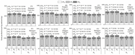 GPN, GPP and GPK of double cropping rice (A–H) response to the nitrogen (N) rate and plant density in two different ecological regions in 2018 and 2019. N1 and N2 represent 120 and 150 kg ha−1 for early rice and N1 and N2 represent 120 and 165 kg ha−1 for late rice. D1, D2 and D3 represent 86, 143 and 200 plants per m2 for early rice and D1, D2 and D3 represent 57, 114 and 172 plants per m2 for late rice. Values followed by different lowercase letters are significantly different at the 0.05 level. NS, * and ** represent no significant difference and significant difference at the 5% and 1% levels.