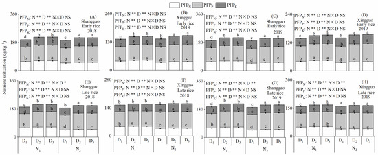 PFPN, PFPP and PFPK of double cropping rice (A–H) response to the N rate and plant density in two different ecological regions in 2018 and 2019. N1 and N2 represent 120 and 150 kg ha−1 for early rice and N1 and N2 represent 120 and 165 kg ha−1 for late rice. D1, D2 and D3 represent 86, 143 and 200 plants per m2 for early rice and D1, D2 and D3 represent 57, 114 and 172 plants per m2 for late rice. Values followed by different lowercase letters are significantly different at the 0.05 level. NS, * and ** represent no significant difference and significant difference at the 5% and 1% levels.