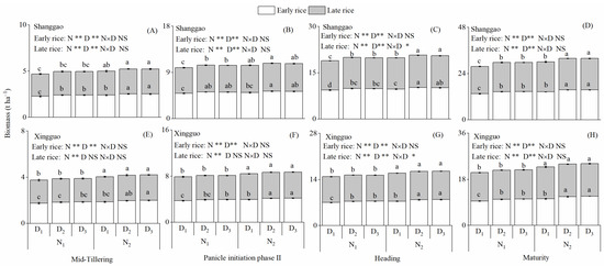 Biomass accumulation dynamics of double cropping rice (A–H) response to the N rate and plant density in two different ecological regions in 2018. N1 and N2 represent 120 and 150 kg ha−1 for early rice and N1 and N2 represent 120 and 165 kg ha−1 for late rice. D1, D2 and D3 represent 86, 143 and 200 plants per m2 for early rice and D1, D2 and D3 represent 57, 114 and 172 plants per m2 for late rice. Values followed by different lowercase letters are significantly different at the 0.05 level. NS, * and ** represent no significant difference and significant difference at the 5% and 1% levels.