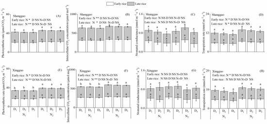 Photosynthetic characteristics of double cropping rice (A–H) response to the N rate and plant density in two different ecological regions in 2018. N1 and N2 represent 120 and 150 kg ha−1 for early rice and N1 and N2 represent 120 and 165 kg ha−1 for late rice. D1, D2 and D3 represent 86, 143 and 200 plants per m2 for early rice and D1, D2 and D3 represent 57, 114 and 172 plants per m2 for late rice. Values followed by different lowercase letters are significantly different at the 0.05 level. NS, * and ** represent no significant difference and significant difference at the 5% and 1% levels.