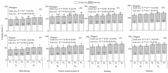 N absorption dynamics of double cropping rice (A–H) response to the N rate and plant density in two different ecological regions in 2018. N1 and N2 represent 120 and 150 kg ha−1 for early rice and N1 and N2 represent 120 and 165 kg ha−1 for late rice. D1, D2 and D3 represent 86, 143 and 200 plants per m2 for early rice and D1, D2 and D3 represent 57, 114 and 172 plants per m2 for late rice. Values followed by different lowercase letters are significantly different at the 0.05 level. NS, * and ** represent no significant difference and significant difference at the 5% and 1% levels.