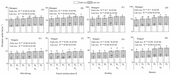 Phosphate absorption dynamics of double cropping rice (A–H) response to the N rate and plant density in two different ecological regions in 2018. N1 and N2 represent 120 and 150 kg ha−1 for early rice and N1 and N2 represent 120 and 165 kg ha−1 for late rice. D1, D2 and D3 represent 86, 143 and 200 plants per m2 for early rice and D1, D2 and D3 represent 57, 114 and 172 plants per m2 for late rice. Values followed by different lowercase letters are significantly different at the 0.05 level. NS, * and ** represent no significant difference and significant difference at the 5% and 1% levels.