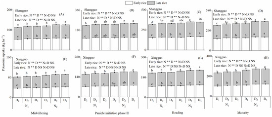 Potassium absorption dynamics of double cropping rice (A–H) response to the N rate and plant density in two different ecological regions in 2018. N1 and N2 represent 120 and 150 kg ha−1 for early rice and N1 and N2 represent 120 and 165 kg ha−1 for late rice. D1, D2 and D3 represent 86, 143 and 200 plants per m2 for early rice and D1, D2 and D3 represent 57, 114 and 172 plants per m2 for late rice. Values followed by different lowercase letters are significantly different at the 0.05 level. NS, * and ** represent no significant difference and significant difference at the 5% and 1% levels.