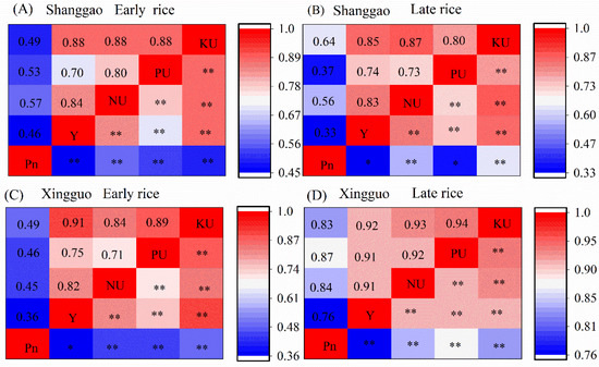 Correlation between the photosynthetic rate at the heading stage and the N, phosphate and potassium uptake at the mature stage of the double cropping rice yield (A–D). * and ** represent significant difference at the 5% and 1% probability levels. Pn, photosynthetic rate; Y, yield; NU, N uptake; PU, phosphate uptake; KU, potassium uptake.