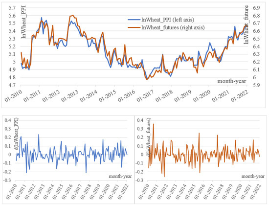 The series of futures prices (Figure 1) arose from contracts with the highest trading volume. Therefore, it is possible to present data in such a long time series. Futures quotes are quoted in the continuous trading system; here is the first quotation in a given month. Figure 1 also shows the wheat price PPI. Both series were expressed as logarithms.