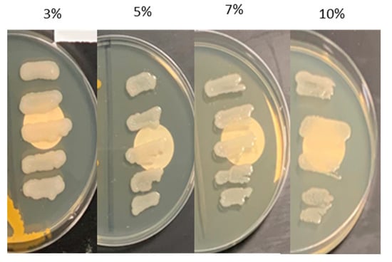 Elevated salinity is a major environmental concern and negatively impacts food security worldwide []. Good DPM17 growth under high NaCl concentration coincides with that reported for Bacillus sp., which could grow at 12% NaCl [,,]. According to the classification of halophilic organisms, DPM17 is a moderately halophilic PGPB, as evidenced by growth at 10% NaCl. Additionally, halotolerant PGPB inoculation promotes the yield of many crops in saline soils []. Halophilic/halotolerant PGPB possess a selective advantage over halophobic PGPB, enabling them to exist in saline localities [].