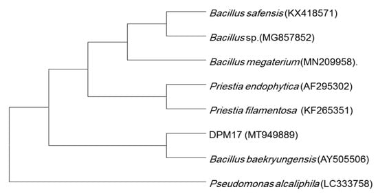 DNA was extracted from mid-exponential phase DPM17 cells by boiling an aliquot at 95 °C for 5 min and then centrifuging at 10,000 rpm for 10 min to precipitate the cells []. Briefly, 1 μL supernatant was used as the template for subsequent PCR amplification of the 16S rRNA gene using the primer pair 27F 5′-AGAGTTTGATCMTGGCTCAG-3′ and 1492R 5′-TACGGYTACCTTGTTACGACTT-3′. The PCR conditions for 30 amplification cycles have been described previously []. The PCR amplicons were then analyzed by electrophoresis on a 1% agarose gel in a 100 mL 1× TAE buffer. The amplicon size was determined using a 1 kb DNA ladder. The 16S rRNA gene of DPM17 was sequenced using an automated DNA sequencing system (Applied Biosystems model 3730XL, Foster City, CA, USA). Phylogenetic trees were constructed using the freely available software MEGA7 (version 7.0, Molecular Evolutionary Genetics, Philadelphia, PA, USA) []. The evolutionary history was inferred using the neighbor-joining method []. The optimal tree with a sum of branch length = 0.38845289 is shown. The evolutionary distances were computed using the maximum composite likelihood method involving eight nucleotide sequences including first, second, third, and noncoding nucleotides and are expressed as the number of base substitutions per site []. All positions containing gaps and missing data were eliminated. The final dataset contained 1343 positions. Evolutionary analyses were conducted using MEGA7 [].