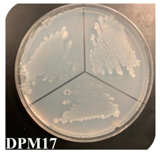 Phosphate solubilization assays were performed by streaking DPM17 on Pikosvkaya agar containing calcium triphosphate (Ca3(PO4)2) as the phosphate source (5 g), yeast extract (0.50 g), dextrose (10 g), ammonium nitrate (NH4NO3, 0.50 g), sodium chloride (NaCl, 0.20 g), magnesium sulfate (MgSO4, 0.10 g), and agar (15 g) []. After incubating at 30 °C for 72 h, clear halo zone formation around DPM17 colonies was recorded as a positive result [].