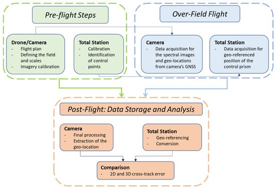 The workflow that describes the steps followed during the pre-flight, over-field flight, and after the flight, in terms of the instrumentation and setup, data acquisition, and data analysis, respectively, is given in Figure 1. In the initial phase, it is very important to properly plan the flight since the flight path, adequate overlap for both longitudinal and transverse, and sunlight angle have a significant impact on the radiometric calibration of the multispectral camera. Besides that, the identification of control points in the field was one of the initial, but very crucial for the accurate performance of the TS. This was followed by the data acquisition for both spectral images and the georeferenced position of the attached prism, in terms of data from the multispectral camera and the TS, respectively. The final phase included the analysis and comparison of both camera and TS data. All three phases are described in detail in the following sections.