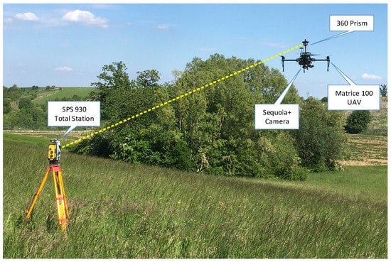 In many cases, the corrections mentioned above are automatically performed when post-processing the data obtained from a Sequoia+ (Parrot Drones SAS, Paris, France) or RedEdge-MX (AgEagle Aerial Systems Inc. Wichita, KS, USA) using commercial software (e.g., the Pix4Dmapper (Pix4D S.A, Prilly, Switzerland) software [17,18]). However, and this is the case with most commercial products, the algorithms and modeling implemented in these data processing software packages are unknown to the scientific community [19]. At this stage of processing multispectral drone data, based on the authors’ knowledge, there is no open-source software or specific references currently available for handling the evaluation of the multispectral sensor performance, especially the accuracy of georeferencing [20]. In addition to these, there have been very limited studies on evaluating the performance of the cameras integrated into UAVs by using contemporary sensors such as total stations (TS) whose high-level accuracy at a sub-centimeter level has been thoroughly tested and assessed [21]. Implementing those types of sensors could assist in more accurately evaluating the positioning errors of the engaged cameras together with the UAV.