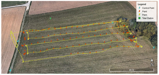 Initially, a stationing procedure for the TS was necessary. This is a method of determining the location of one unknown point in relation to known points. In this case, the unknown point was the point of the TS. To do this, several stationing points (i.e., points with known coordinates) are necessary. Four points were marked on the field surface (Figure 4 and Figure 5) and the position of these points was measured by using an RTK-GNSS. After the coordinates of these points are inserted in the TS and are also measured by placing the prism on the fixed locations, the TS performs internally a geometric rigid transformation to be able to output the position data in a fixed coordinate system. The world geodetic system 84 (WGS84) was chosen as the reference geodetic datum as this was also used by the D-GNSS receiver.