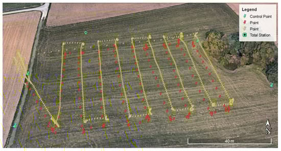The experiments took place at the research station of the University of Hohenheim (48°44′39.6″ N 8°55′25.9″ E-Ihinger Hof, Renningen, Germany). For comparison reasons, two sets of measurements were obtained. In the first set, the route of the UAV was designed to follow parallel passes along the East–West (E–W) axis, while in the second one, the UAV was moving along the South–North (S–N) axis. The satellite view with the positions of the prism (yellow pins) and the positions of the images (red pins) for the E–W and S–N experiment is presented in Figure 4 and Figure 5, respectively. As it can be seen from the two figures, a deviation occurred from the corresponding axes, but this was inevitable due to the orientation of the field that was used for setting up the performed routes, and it was regarded as acceptable for this research.