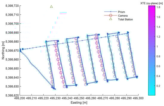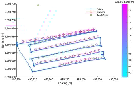 In Figure 8, the obtained position data from the camera (circles) and the prism (stars) of the E–W experiment in the -plane are presented. These position data refer to points O and A, as shown in Figure 3. Since only the images that are acquired during the parallel passes of the UAV are usually utilized in agriculture-related operations, the images that corresponded to the turning parts of the route were filtered out. The color of the circles corresponds to the 2D XTE calculated by using Equation (1) and by subtracting the fixed distance of Equation (2). As it can be seen from the colorbar on the right side of the figure, the XTE reached a value almost equal to 2.4 m. The same information for the S–N experiment is presented in Figure 9. In that case, the XTE had a maximum value of around 1.8 m. It is already clear from Figure 8 and Figure 9 that the XTE is not a value that varies rapidly while it indicates a drift. This has been identified by the authors in previous research where the position assessment offered by a D-GNSS was also examined [26].