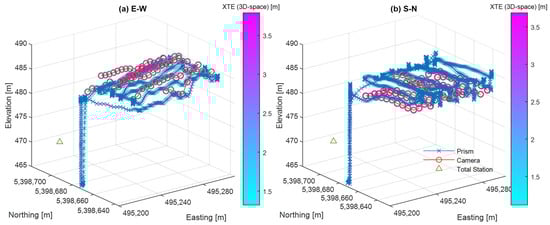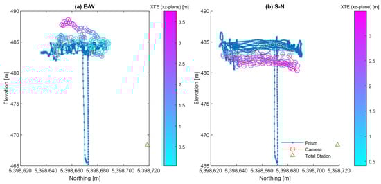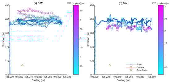 In Figure 10, the camera and the prism positions of the E–W (Figure 10a) and the S–N (Figure 10b) experiment in the -plane can be seen. The same information in the -plane is presented in Figure 11a,b, respectively. An XTE that reaches up to more than 3.5 for both planes for the E–W experiment can be seen, while for the S–N experiment, the XTE lies between 3 and 3.5 m. For the E–W experiment, several camera position data are above the prism position. For the S–N experiment, the opposite can be seen as several camera position data are indicated below the prism position. In any case, the XTE in the vertical planes appears to be higher than in the horizontal plane.