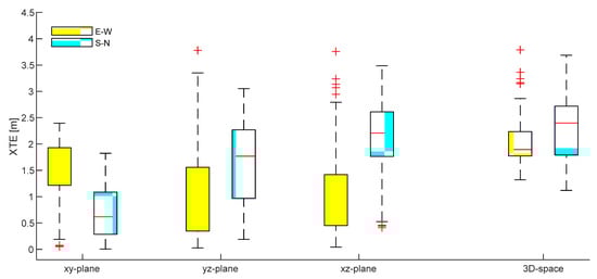 The XTE box plots for all obtained data were produced using MATLAB’s function boxplot, and are presented in Figure 13. On each box, the central red line mark is the median, and the edges of the box are the 25th and 75th percentiles. The distance between the bottom and top of each box is the interquartile range. The whisker extends to the most extreme data value that is not an outlier (a value that is more than 1.5 times the interquartile range away from the bottom or top of the box), while the outliers are illustrated with a red cross. It can be seen that the XTE for the E–W experiment had a higher median in the -plane compared to the - and -plane. For the S–N experiment, this was exactly the opposite with a lower XTE median value for the -plane. As it is depicted, although it is important to know which plane the XTE come from, it is essential to calculate the 3D XTE to get a clearer view of the results. This becomes evident in the right side of Figure 13 where the 3D XTE appears to be in a similar range for both E–W and S–N experiments.